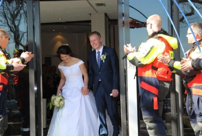 Afgelopen vrijdag 1 april, en dat was geen grap, traden aankomend opstapper Elise van Dam en haar Nittert Wiertsema in het huwelijksbootje. De weergoden waren het stel goed gezind. Toen het kersverse stel het stadhuis verliet, werden ze verrast door de collega’s van ons station. Ze hadden met bloemenbogen een erehaag gevormd waardoor het stel samen hun gelukkige toekomst tegemoet konden lopen. Nogmaals van harte gefeliciteerd en heel veel gelukt samen toegewenst.