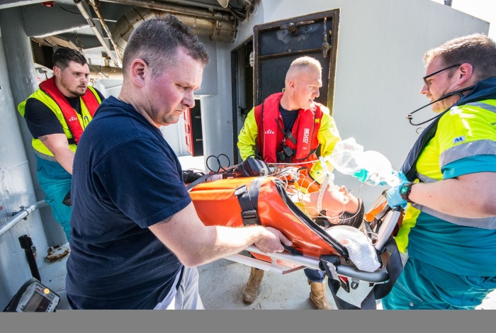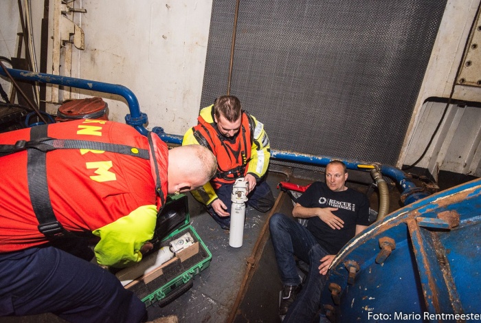 Twee opstappers van de reddingboot worden overgezet samen met de spullen die gereed staan. Door de bemanning van de Schotsman worden ze naar het ‘slachtoffer’ geleid. Aangekomen in de pompkamer melden ze een persoon met pijn op de borst aan getroffen te hebben. Op de vraag of er nog meer middelen nodig zijn blijkt dit niet zo te zijn en wordt besloten de inmiddels gearriveerde ambulance op te gaan halen.