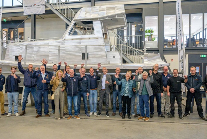 Afgelopen vrijdag vond bij scheepswerf Habbeke in Hoorn de officiële kiellegging plaats, een traditie waarbij de start van de bouw wordt verzegeld door een muntje in een aluminium schijf in de kiel van de boot te plaatsen.