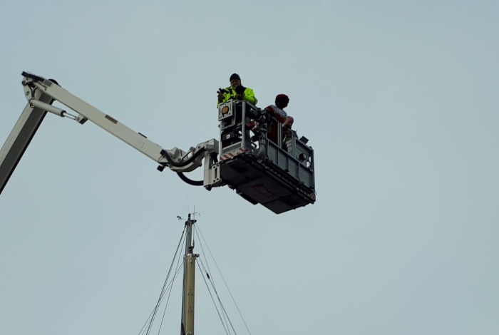 De hoogwerker van de brandweer werd naast het KNRM boothuis opgesteld om van grote hoogte te kunnen zien wat er op water aan de hand was.