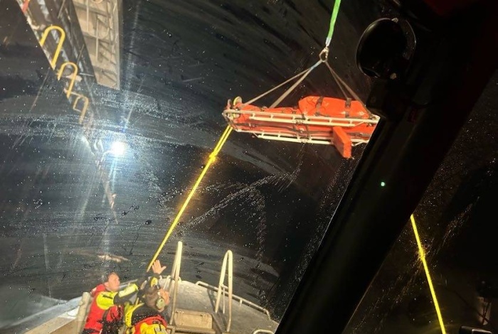 De patiënt is met een brancard van boord gehesen naar de reddingboot. Het afhijsen op open water vraagt nauwkeurige samenwerking en rust. Dankzij de goede afstemming aan boord verliep dit veilig en beheerst.