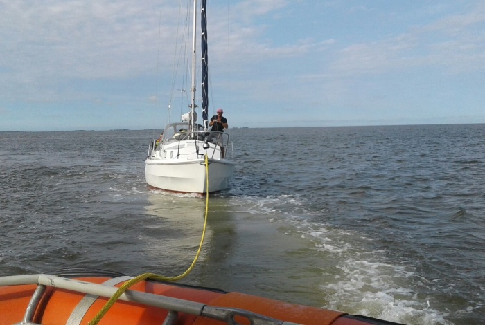Ter plekke aangekomen bleek het jacht nog behoorlijk vast te zitten, één van de opstappers is vervolgens met de sleeplijn naar het zeiljacht gelopen en heeft een sleepverbinding gemaakt.