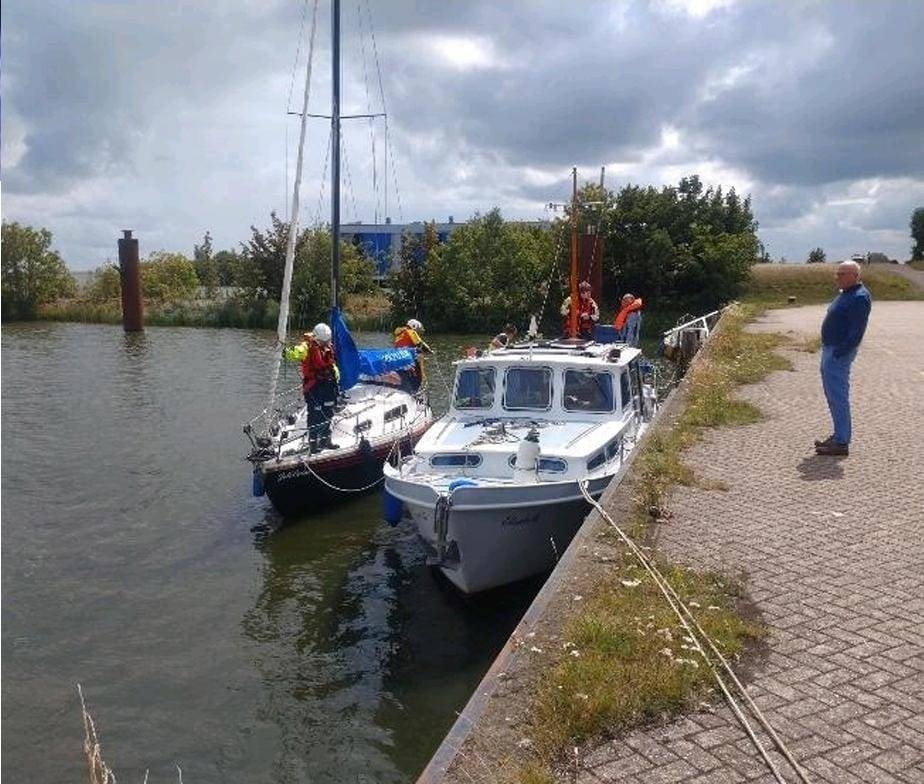 Het jacht bleek samen te varen met een zeiljacht van ca. 7 meter, dat eerst zelf probeerde te slepen — helaas brak de sleeplijn. Door het slechte weer en beperkte ervaring aan boord ontstond er paniek.