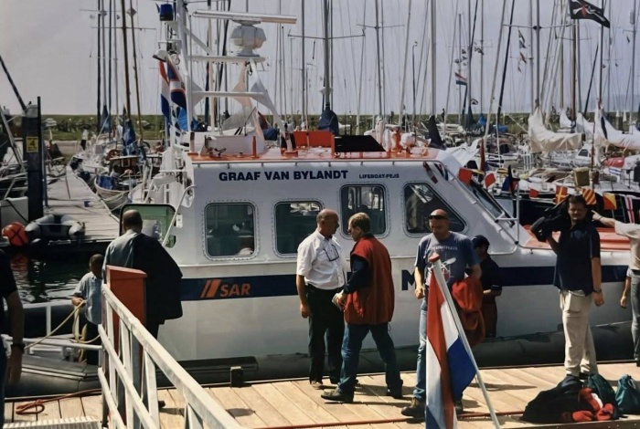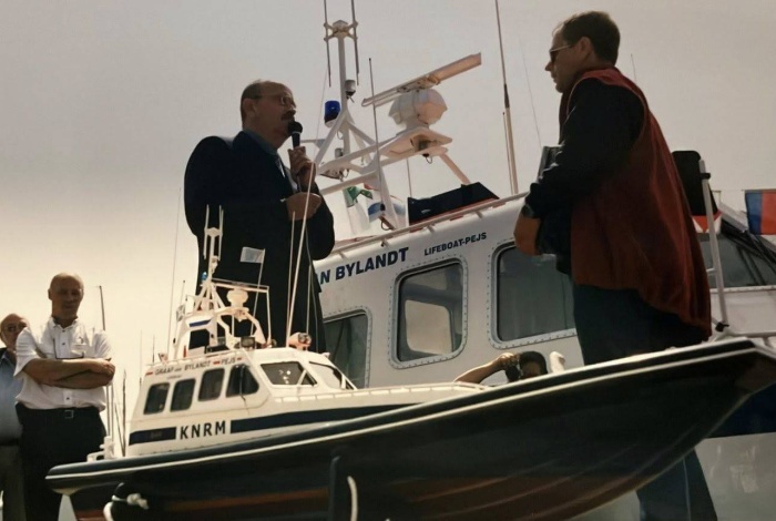 Op een van de foto’s van die dag is te zien hoe burgemeester Rob van der Mark de sleutels van de Graaf van Bylandt overhandigt aan schipper Arie Boon. Op een andere foto staat KNRM-onderdirecteur Nico de Jonge, die die dag bovendien zijn 84e verjaardag vierde.